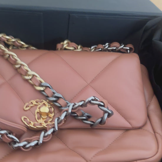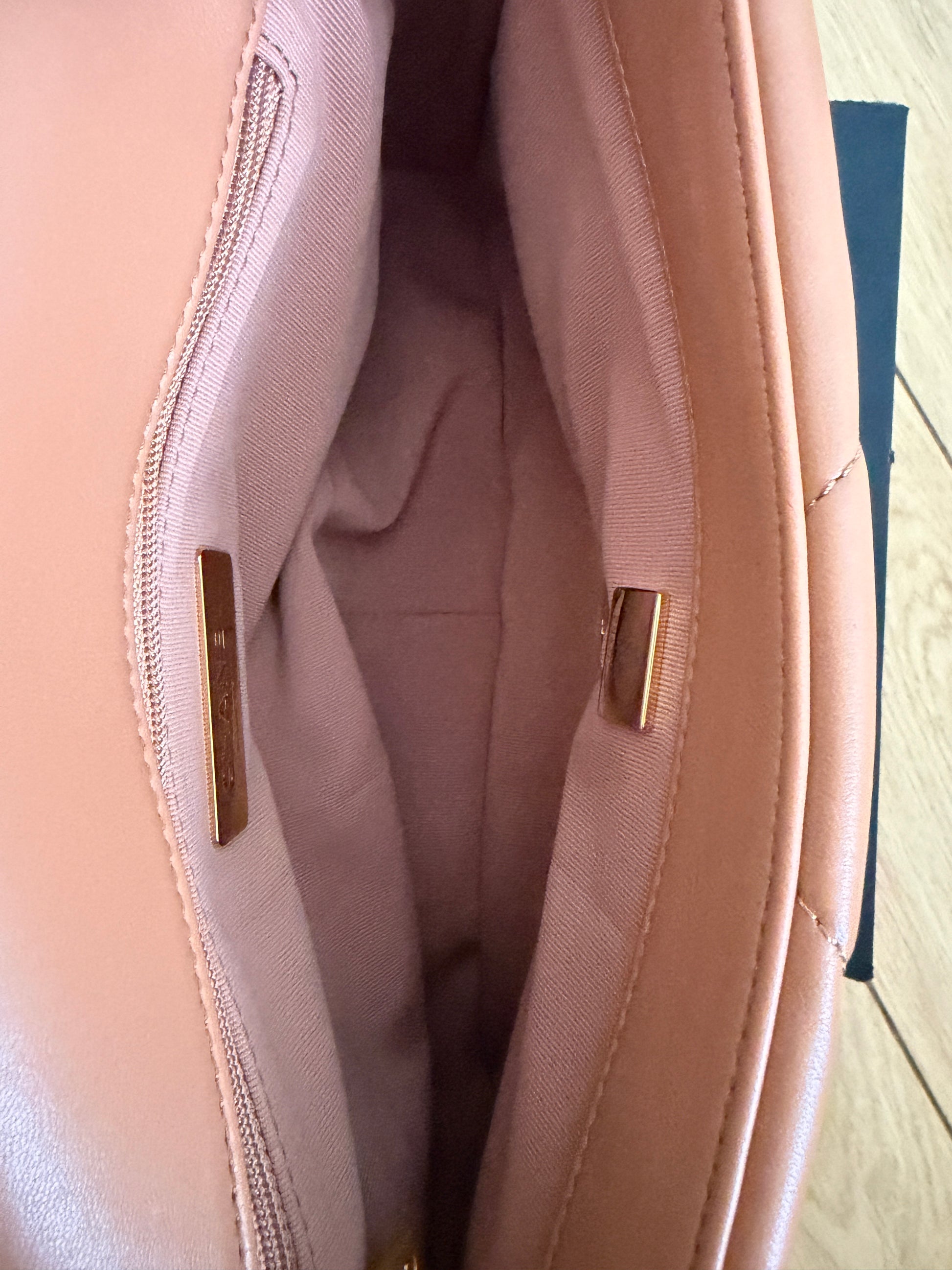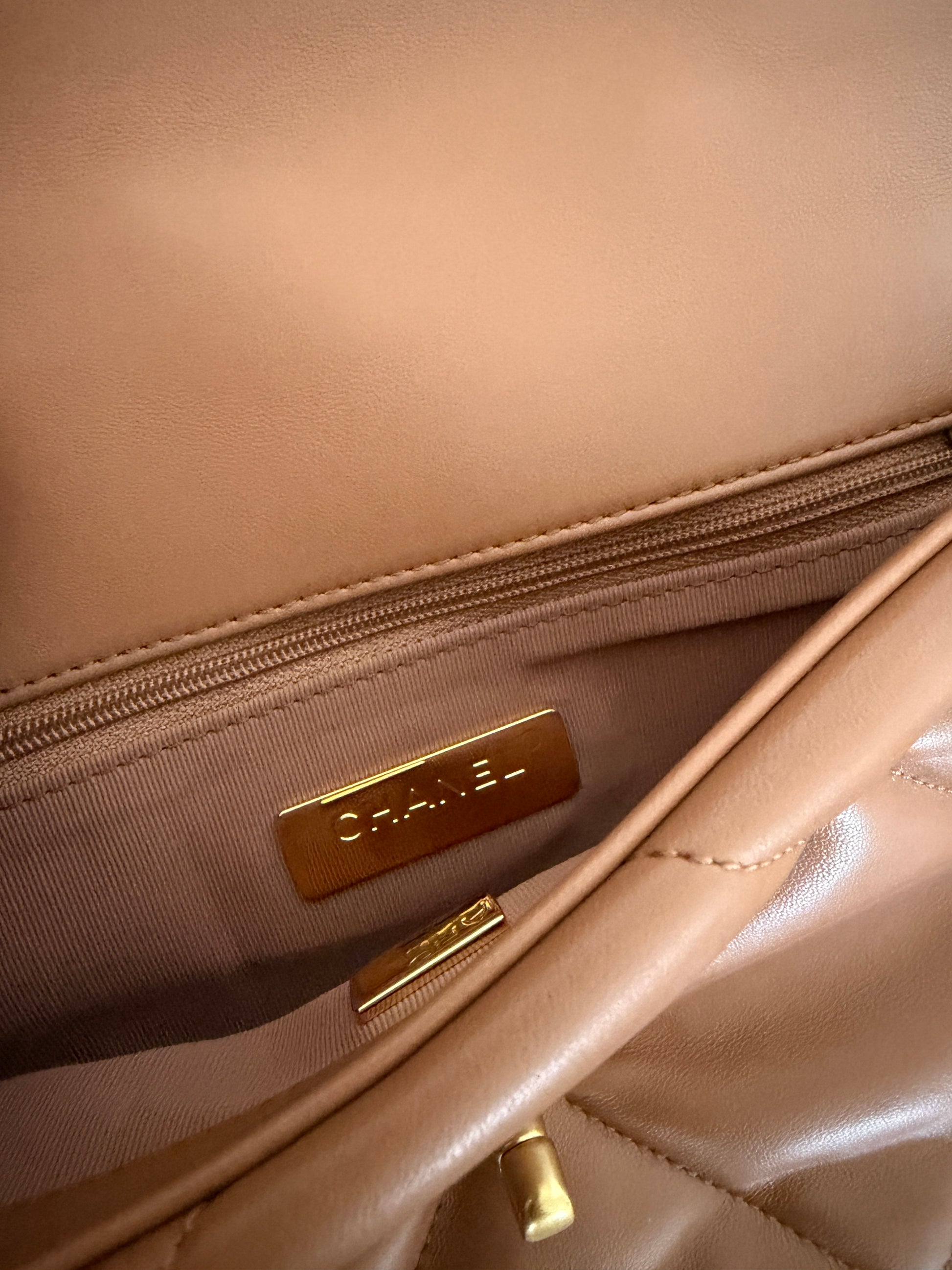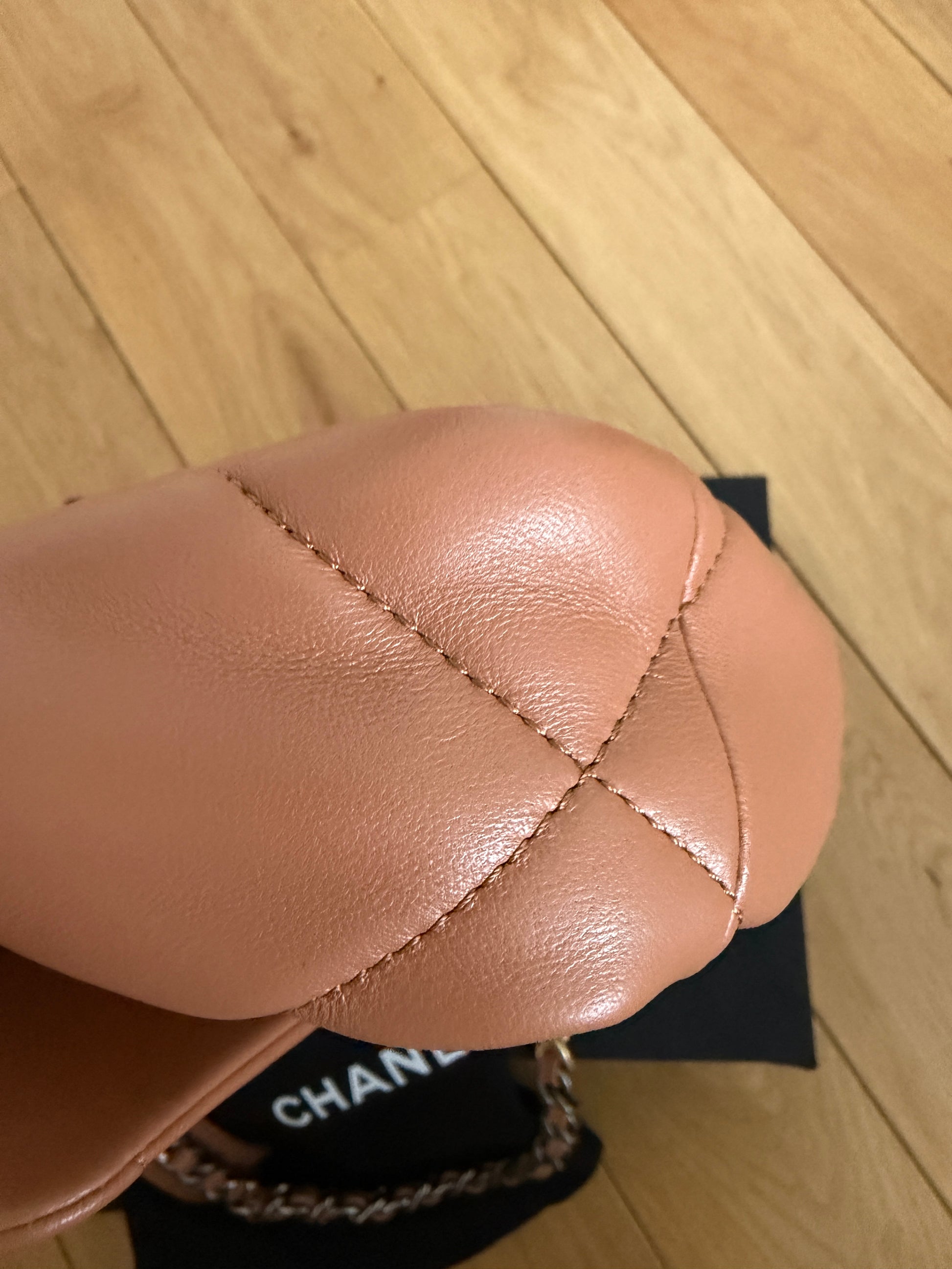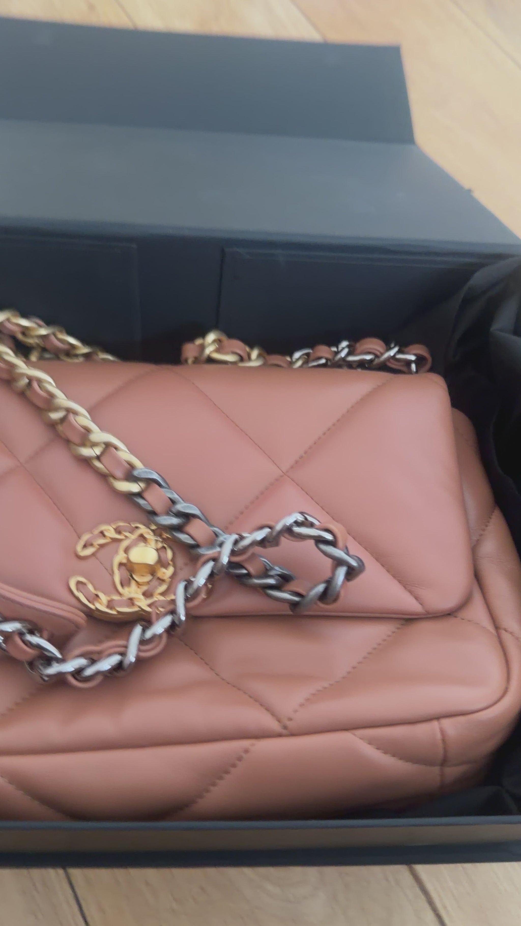 Chanel 19 small w kolorze caramel, piękny głęboki ciepły kolor. Torebka wykonana ze skóry jagnięcej ( lambskin ). Torebka nie była noszona jest jak nowa, nie posiada śladów na skórze, wew czyściutka. Miękka skóra oraz pasek na ramię czyni ją niebywale praktyczną - sporo do niej wejdzie, można nosić na 3 sposoby: w ręku lub na przedramieniu, na ramieniu i na skos. Posiada mikrochip, data produkcji 2022.