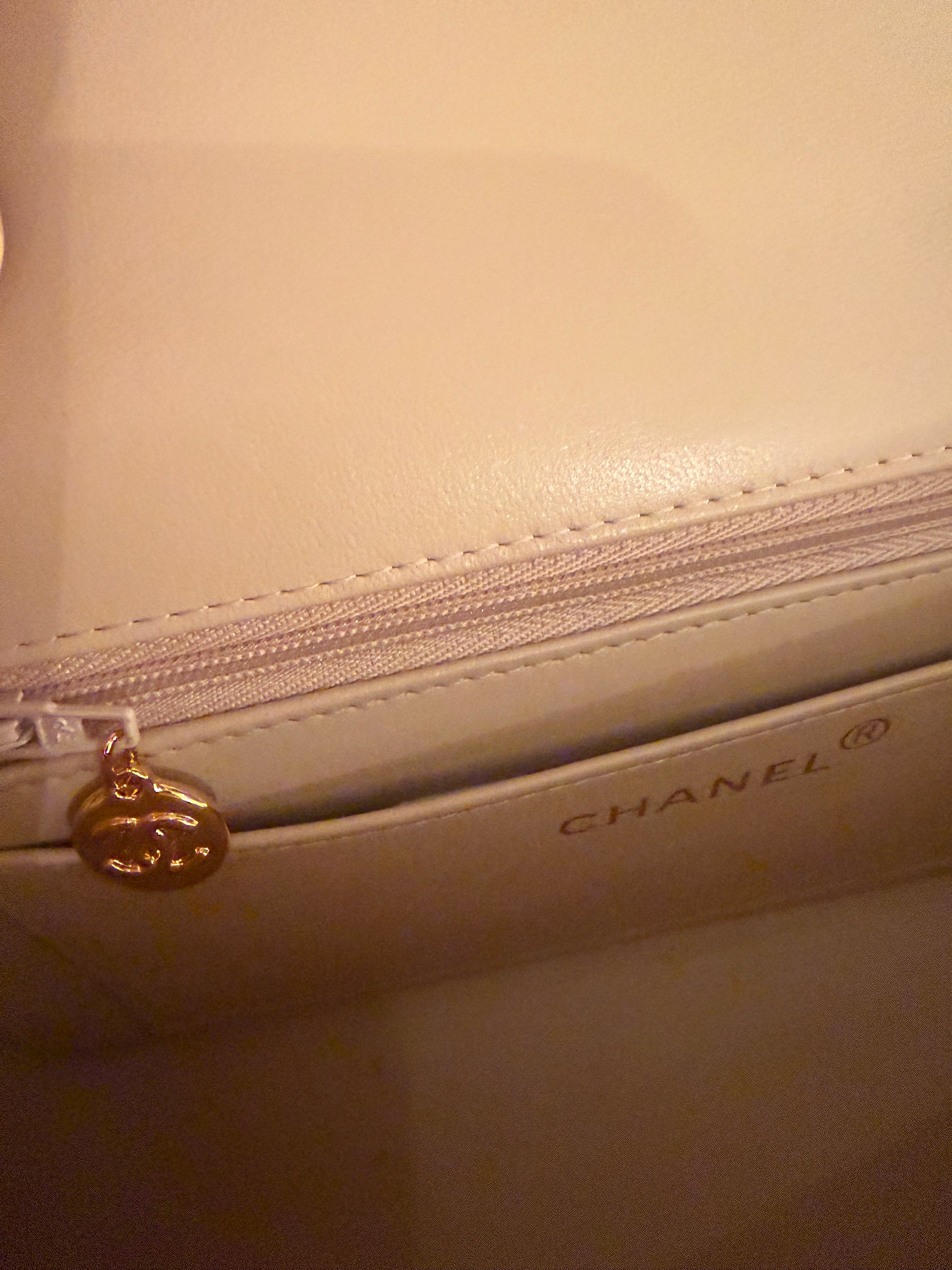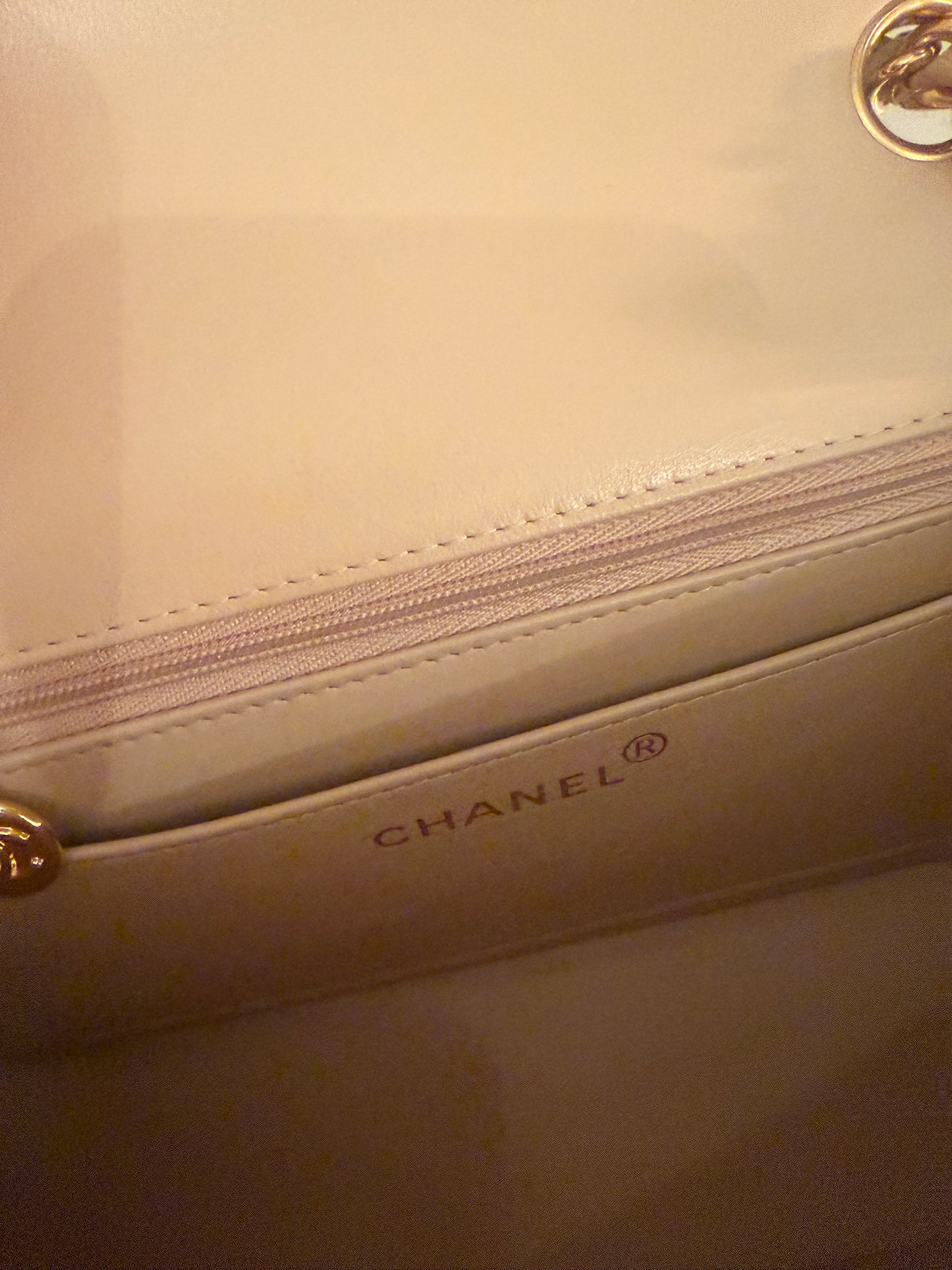 Kultowa i poszukiwana Chanel Diana w rozmiarze small, w beżowej skórze jagnięcej ( lambskin ). Okucia złote. Okazja, torebka bardzo trudno dostępna! Torebka w stanie idealnym jak na swój wiek.