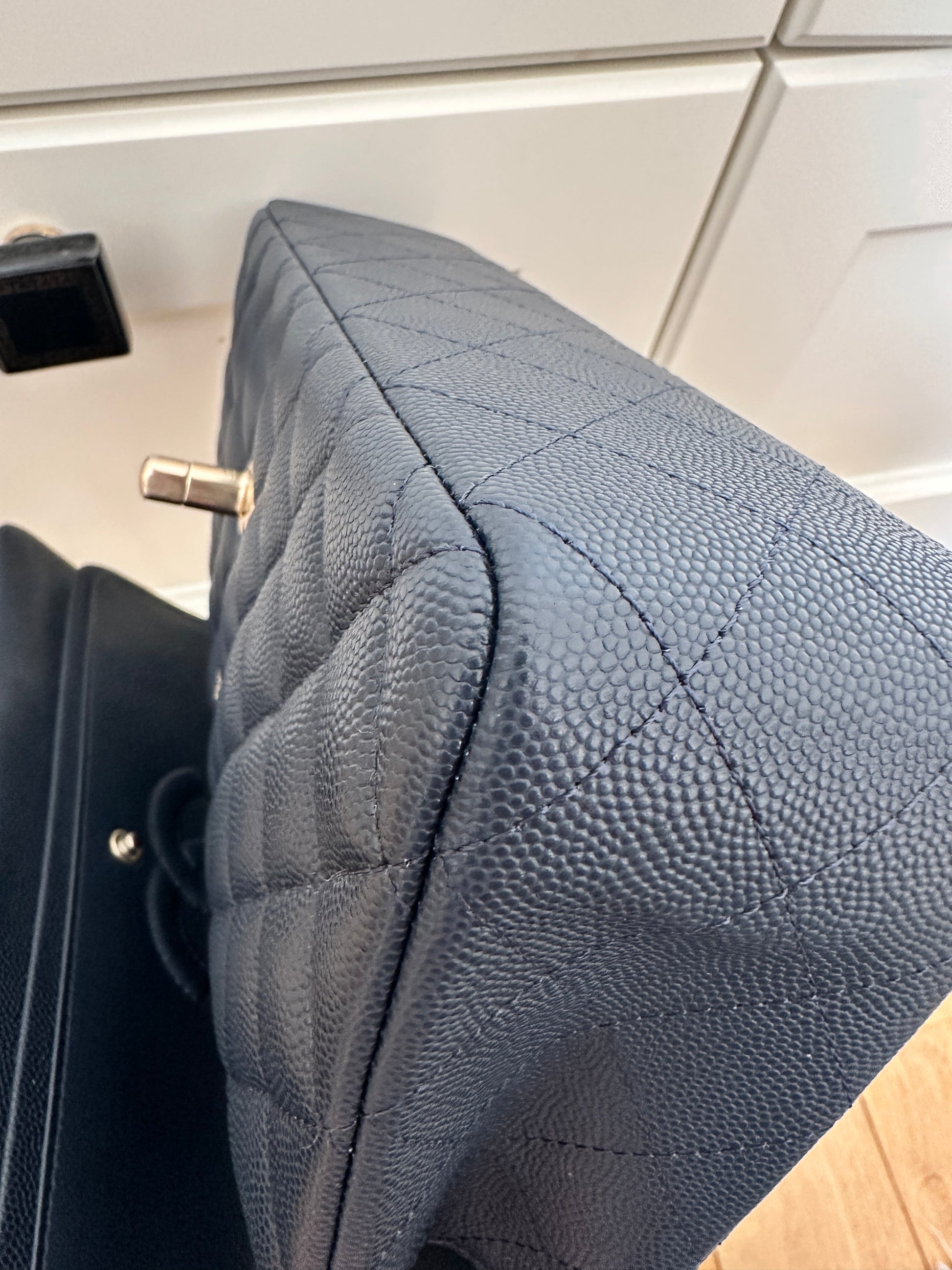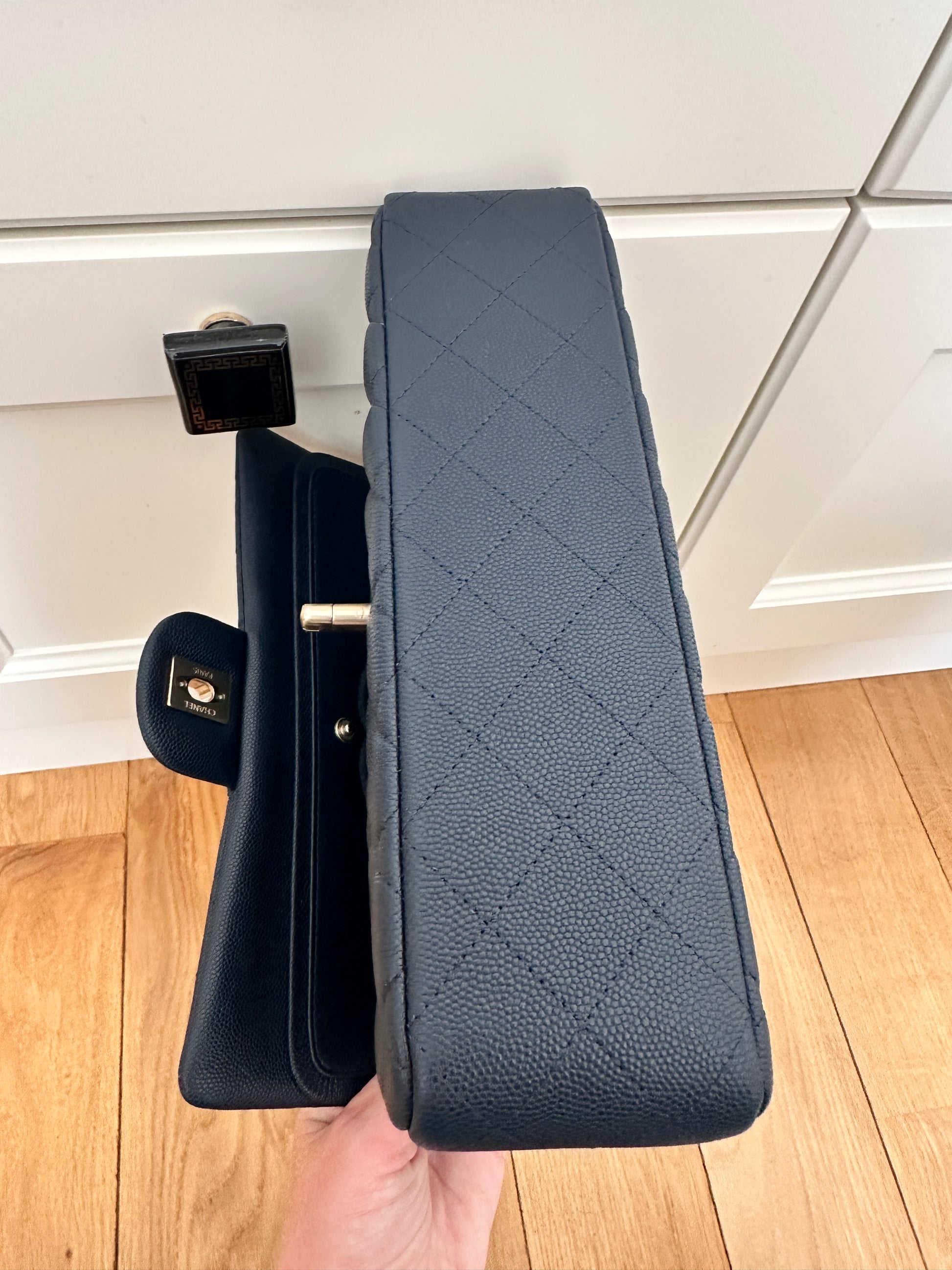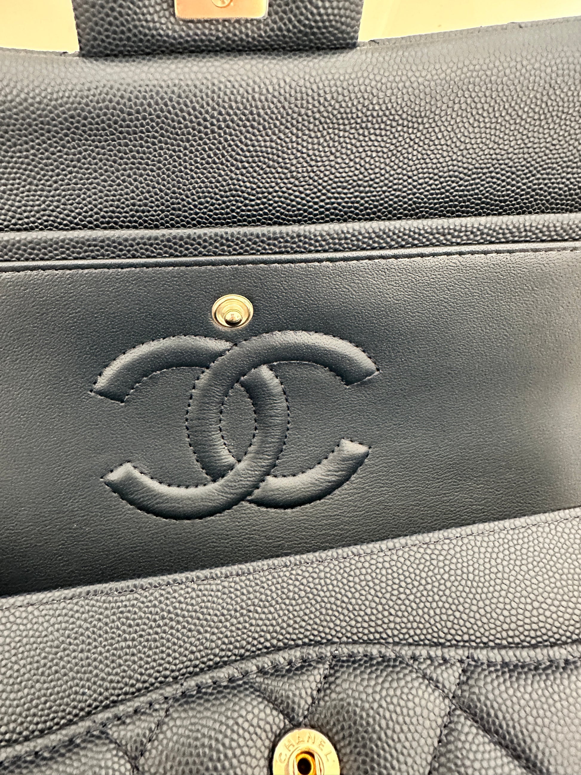 Przepiękna Chanel classic wykonana ze skóry caviar w kolorze granatu z okuciami w kolorze jasnego złota. Środek granatowy. Torebka nie była używana, posiada folie ochronne. Data zakupu 2024. Z mikrochipem.