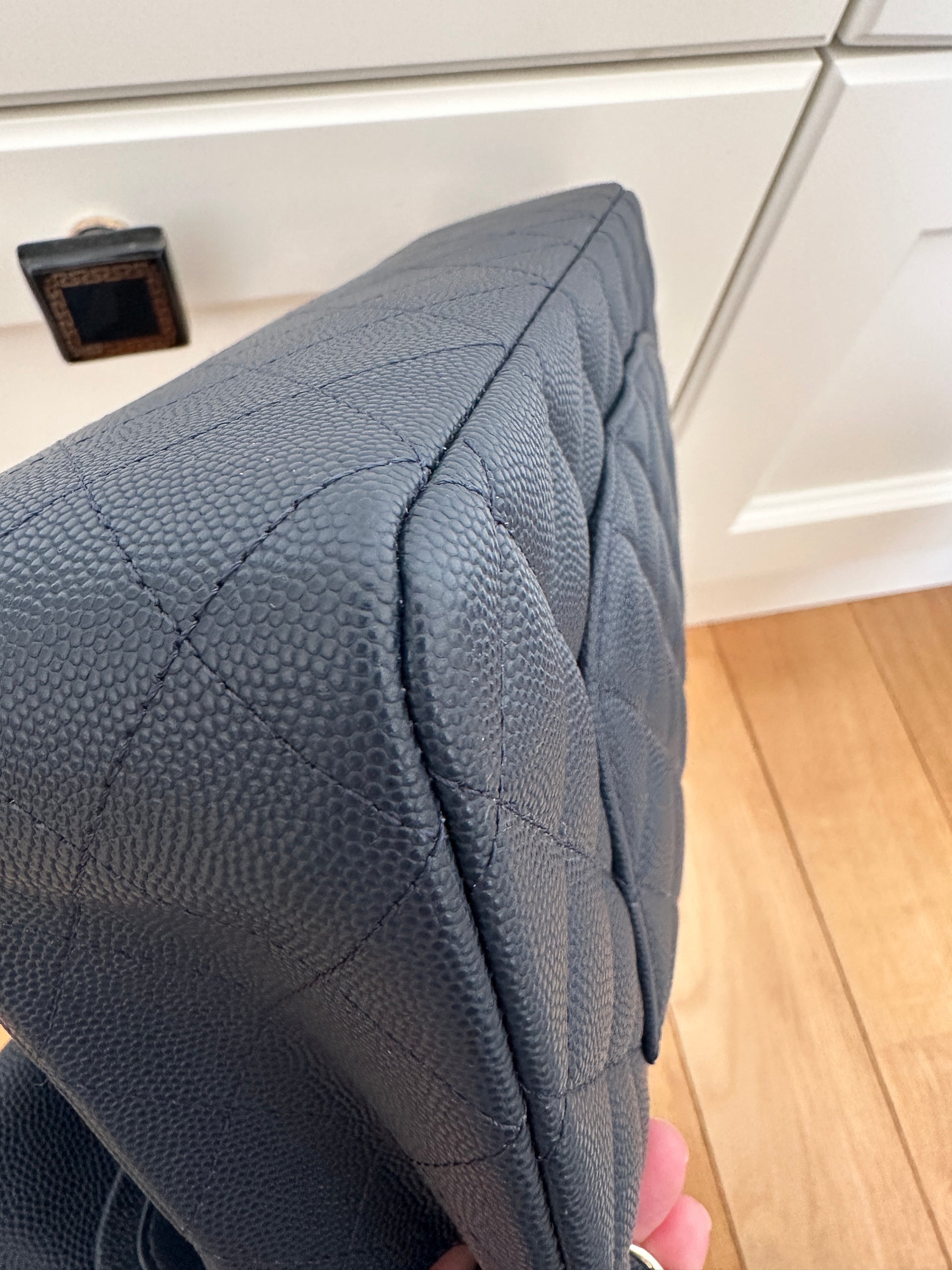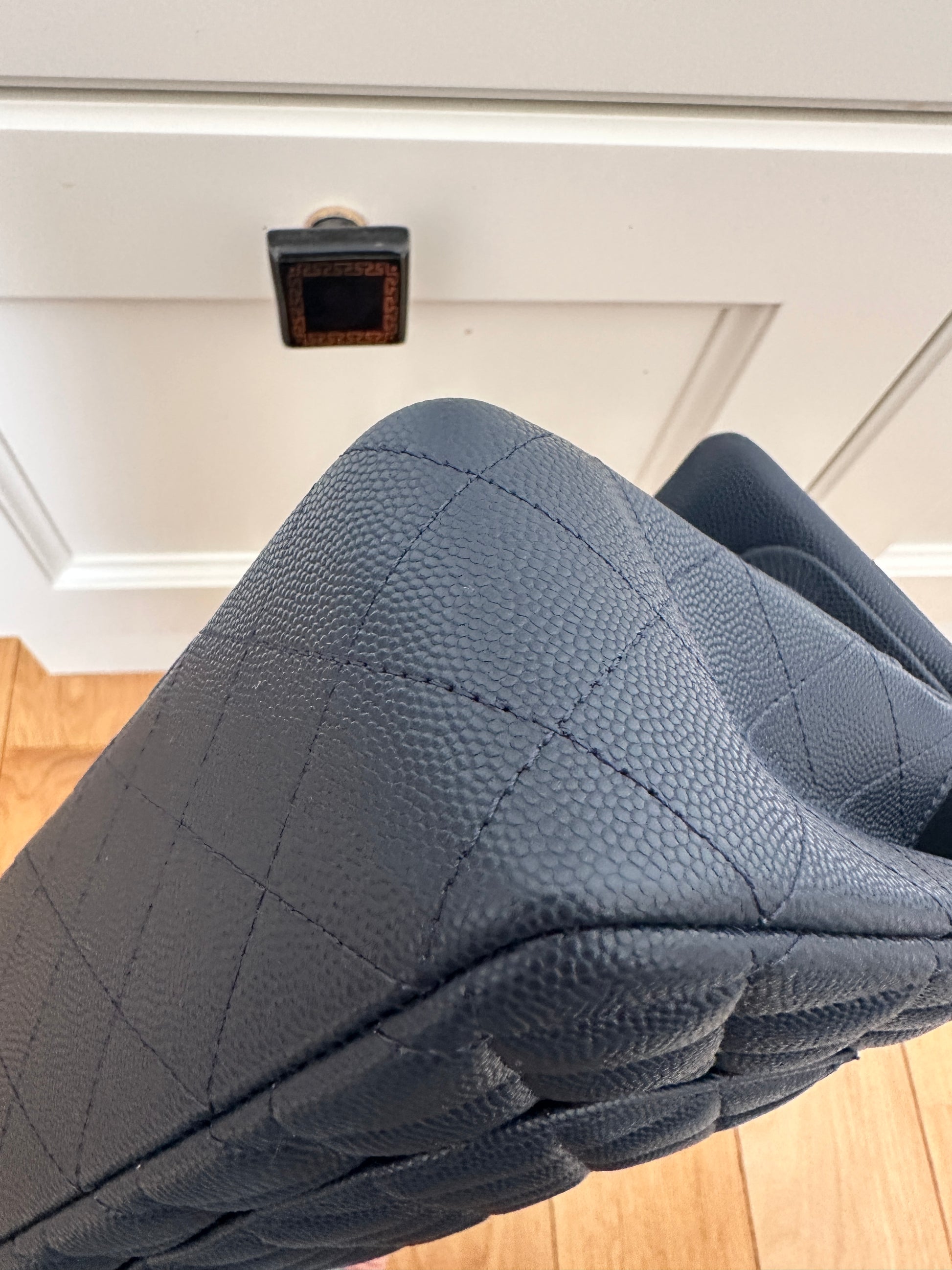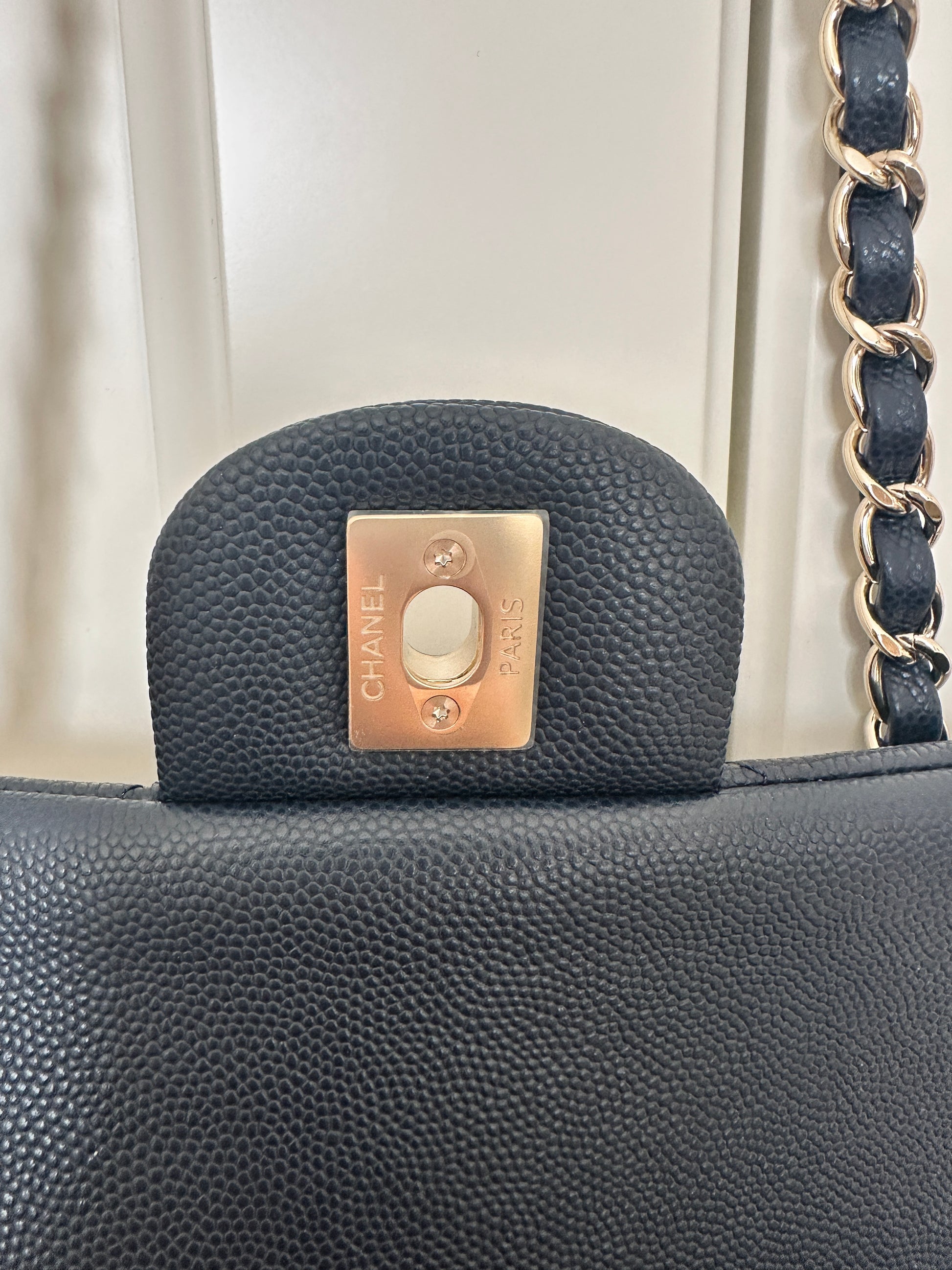 Przepiękna Chanel classic wykonana ze skóry caviar w kolorze granatu z okuciami w kolorze jasnego złota. Środek granatowy. Torebka nie była używana, posiada folie ochronne. Data zakupu 2024. Z mikrochipem.