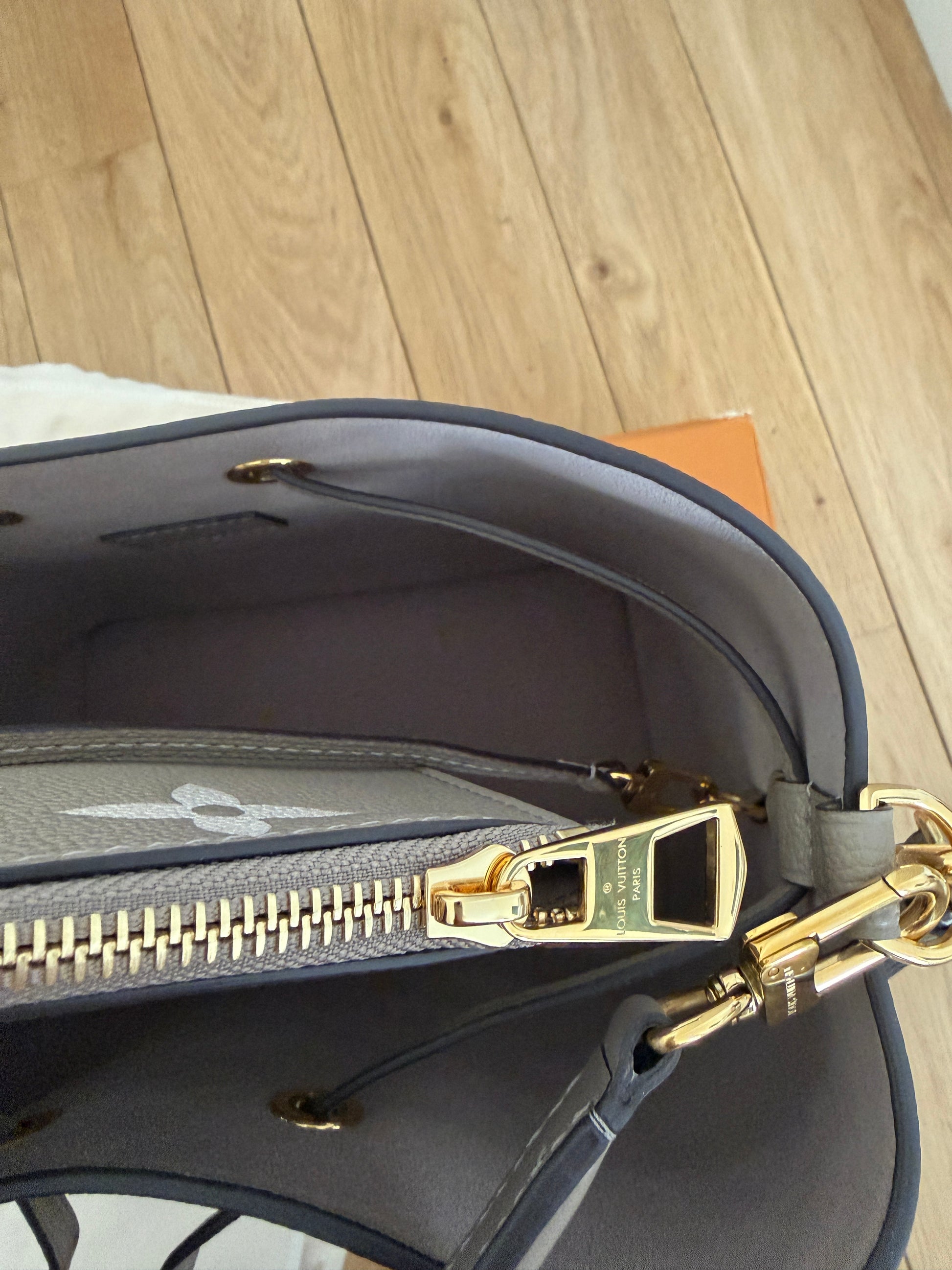 Louis Vuitton Neo Noe MM worek wykonany ze skóry empriente w delikatnym odcieniu tourterelle/creme ( bardzo podobny do taupe ) kawa z mlekiem z odcieniem szarości, prześliczna. Worek nie był używany, trzymany w pudełku. Ta wersja jest większa od klasycznego Neo Noe. Posiada regulowany pasek oraz rączkę. Wew. przegródka na zamek. Torebka z 2023 posiada mikrochip.